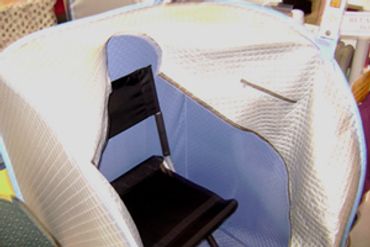 The Relax Sauna Tent is made out of a woven fiber, with silver embedded in this cloth. (It is a cloth, NOT plastic. You can see the weave as you can in cotton sheets.) This gives the cloth a reflecting (mirror-like) quality. With the powerful Warm FIR energy emitted by the semi-conductor chips, and the constant reflecting of this light from part of the tent, energy is easily absorbed and internalized by the body. The energy generated by the Relax Sauna radiator has been documented by the FDA to be between 4-14 microns at temperatures up to 140-170 degrees (FDA K510 number: K053376), and is a medical device. This is uniquely compatible with human energy, and is easily absorbed by the human body. The skin will not burn even after staying in the Relax Sauna for long periods of time. FIR energy is completely safe.